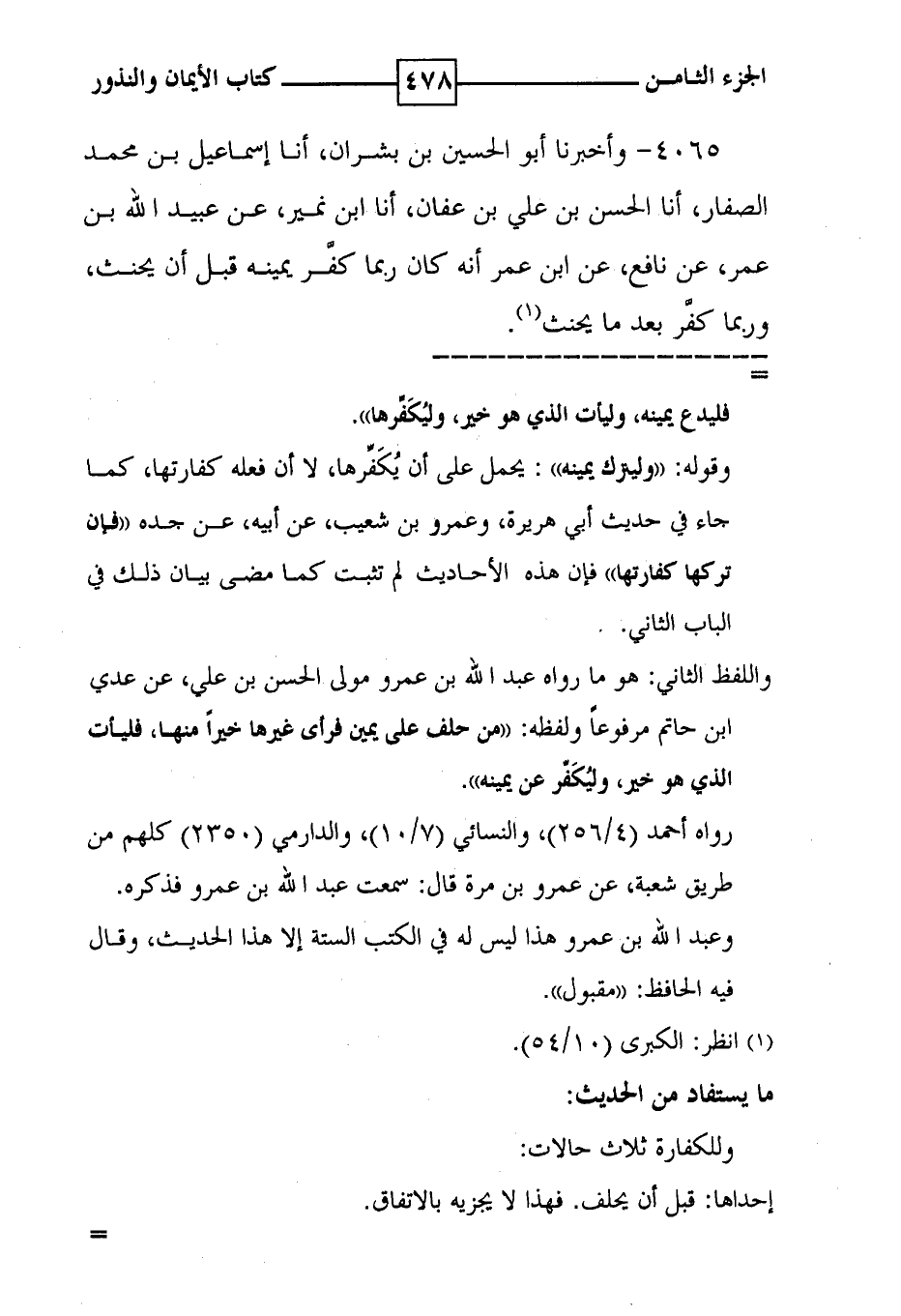 4065 - وأخبرنا أبو الحسين بن بشران ، أنا إسماعيل بن محمد الصفار ، أنا الحسن بن علي بن عفان ، أنا ابن نمير ، عن عبيد الله بن عمر ، عن نافع ، عن ابن عمر أنه كان ربما كفر يمينه قبل أن يحنث ، وربما كفر بعد ما يحنث ( 1 ) .