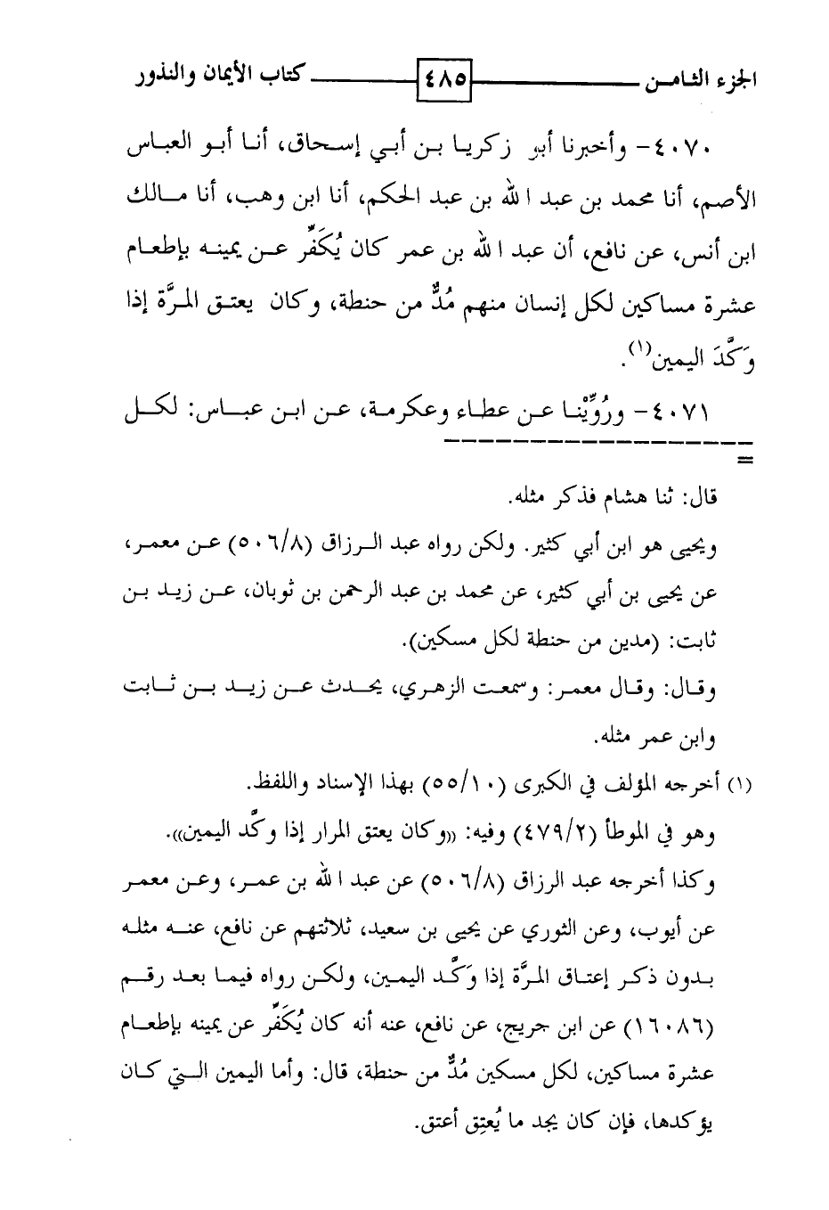 4070 - وأخبرنا أبو زكريا بن أبي إسحاق ، أنا أبو العباس الأصم ، أنا محمد بن عبد الله بن عبد الحكم ، أنا ابن وهب ، أنا مالك ابن أنس ، عن نافع ، أن عبد الله بن عمر كان يكفر عن يمينه بإطعام عشرة مساكين لكل إنسان منهم مد من حنطة ، وكان ليعتق المرة إذا وكد اليمين ( 1 ) .