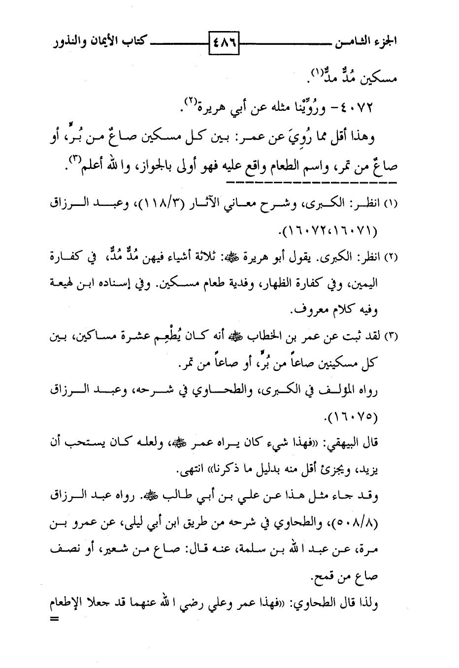 4072 - وروينا مثله عن أبي هريرة ( 2 ) . وهذا أقل مما روي عن عمر : بين كل مسكين صاع من بر ، أو صاع من تمر ، واسم الطعام واقع عليه فهو أولى بالجواز ، والله أعلم ( 3 ) .