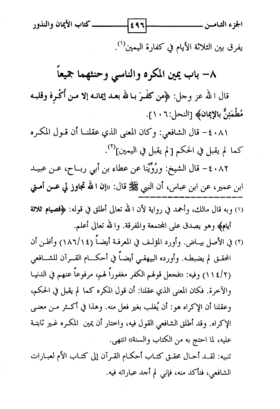 يفرق بين الثلاثة الأيام في كفارة اليمين ( 1 ) . 8 - باب يمين المكره والناسي وحنثهما جميعاً قال الله عز وجل : ( من كفر بالله بعد إيمانه إلا من أكره وقلبه مطمئن بالإيمان ) [ النحل : 106 ] .