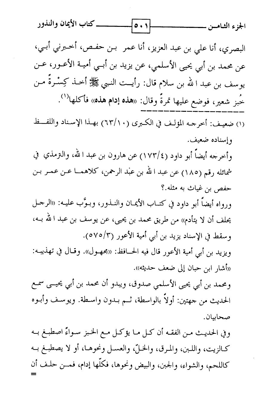 البصري ، أنا علي بن عبد العزيز ، أنا عمر بن حفص ، أخبرني أبي ، عن محمد بن أبي يحيى الأسلمي ، عن يزيد بن أبي أمية الأعور ، عن يوسف بن عبد الله بن سلام قال : رأيت النبي صلى الله عليه وسلم أخذ كسرة من خبز شعير ، فوضع عليها تمرة وقال : ' هذه إدام هذه ' فأكلها ( 1 ) .