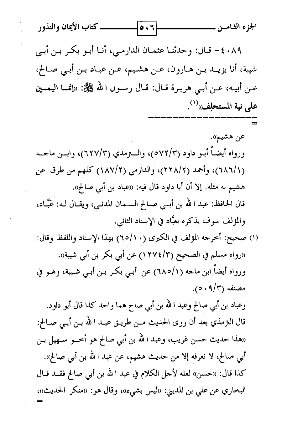 4089 - قال : وحدثنا عثمان الدارمي ، أنا أبو بكر بن أبي شيبة ، أنا يزيد بن هارون ، عن هشيم ، عن عباد بن أبي صالح ، عن أبيه ، عن أبي هريرة قال : قال رسول الله صلى الله عليه وسلم : ' إنما اليمين على نية المستحلف ' ( 1 ) .