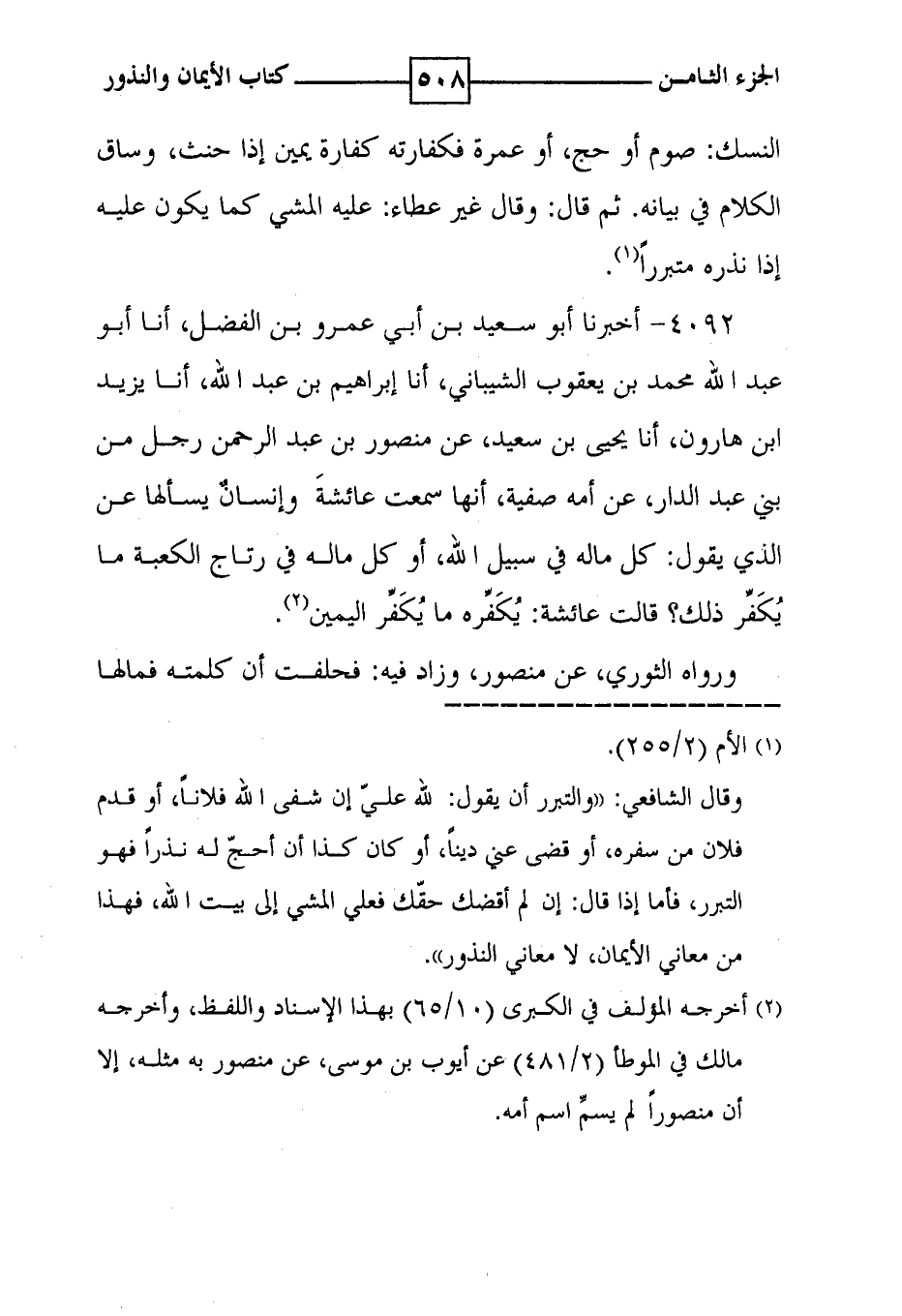 4092 - أخبرنا أبو سعيد بن أبي عمرو بن الفضل ، أنا أبو عبد الله محمد بن يعقوب الشيباني ، أنا إبراهيم بن عبد الله ، أنا يزيد ابن هارون ، أن يحيى بن سعيد ، عن منصور بن عبد الرحمن رجل من بني عبد الدار ، عن أمه صفية ، أنها سمعت عائشة وإنسان يسألها عن الذي يقول : كل ماله في سبيل الله ، أو كل ماله في رتاج الكعبة ما يكفر ذلك ؟ قالت عائشة : يكفره ما يكفر اليمين ( 2 ) . ورواه الثوري ، عن منصور ، وزاد فيه : فحلفت أن كلمته فمالها