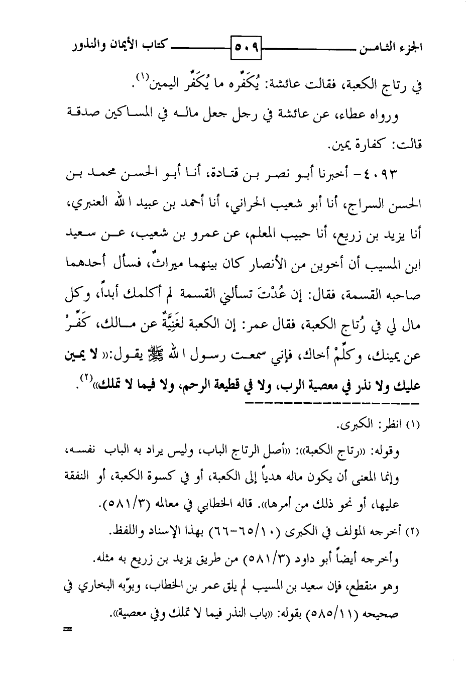 4093 - أخبرنا أبو نصر بن قتادة ، أنا أبو الحسن محمد بن الحسن السراج ، أنا أبو شعيب الحراني ، أنا أحمد بن عبيد الله العنبري ، أنا يزيد بن زريع ، أنا حبيب المعلم ، عن عمرو بن شعيب ، عن سعيد ابن المسيب أن أخوين من الأنصار كان بينهما ميراث ، فسأل أحدهما صاحبه القسمة ، فقال : إن عدت تسألني القسمه لم أكلمك أبداً ، وكل مال لي في رتاج الكعبة ، فقال عمر : إن الكعبة لغنية عن مالك ، كفر عن يمينك ، وكلم أخاك ، فإني سمعت رسول الله صلى الله عليه وسلم يقول : لايمين عليك ولا نذر في معصية الرب ، ولا في قطيعة الرحم ، ولا فيما لا تملك ' ( 2 ) .