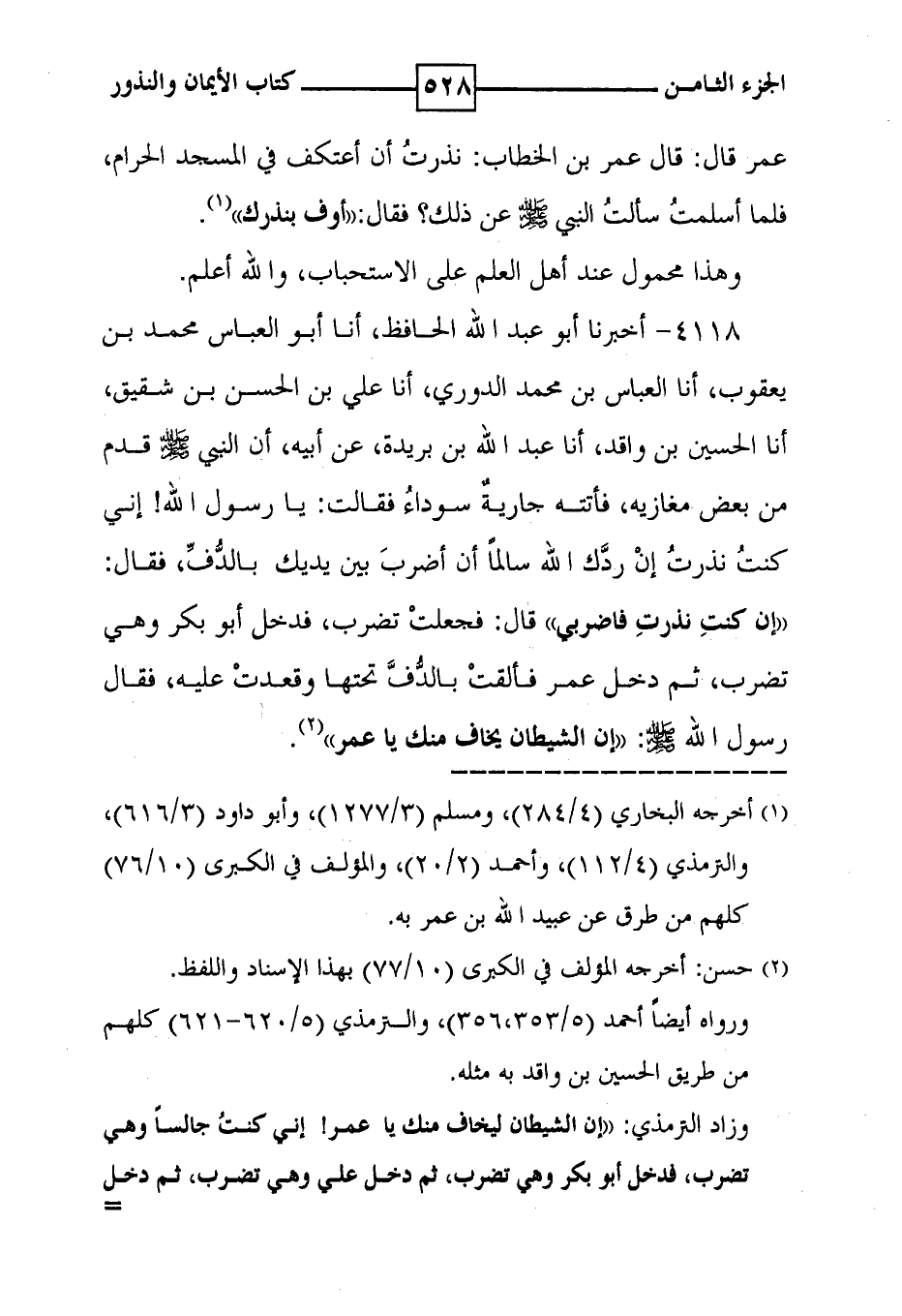 4118 - أخبرنا أبو عبد الله الحافظ ، أنا أبو العباس محمد بن يعقوب ، أنا العباس بن محمد الدوري ، أنا علي بن الحسن بن شقيق ، أنا الحسين بن واقد ، أنا عبد الله بن بريدة ، عن أبيه ، أن النبي صلى الله عليه وسلم قدم من بعض مغازيه ، فأتته جارية سوداء فقالت : يا رسول الله ! إني كنت نذرت إن ردك الله سالما أن أضرب بين يديك بالدف ، فقال : ' إن كنت نذرت فاضربي ' قال : فجعلت تضرب ، فدخل أبو بكر وهي تضرب ، ثم دخل عمر فألقت بالدف تحتها وقعدت عليه ، فقال رسول الله صلى الله عليه وسلم : ' إن الشيطان يخاف منك يا عمر ' ( 2 ) .