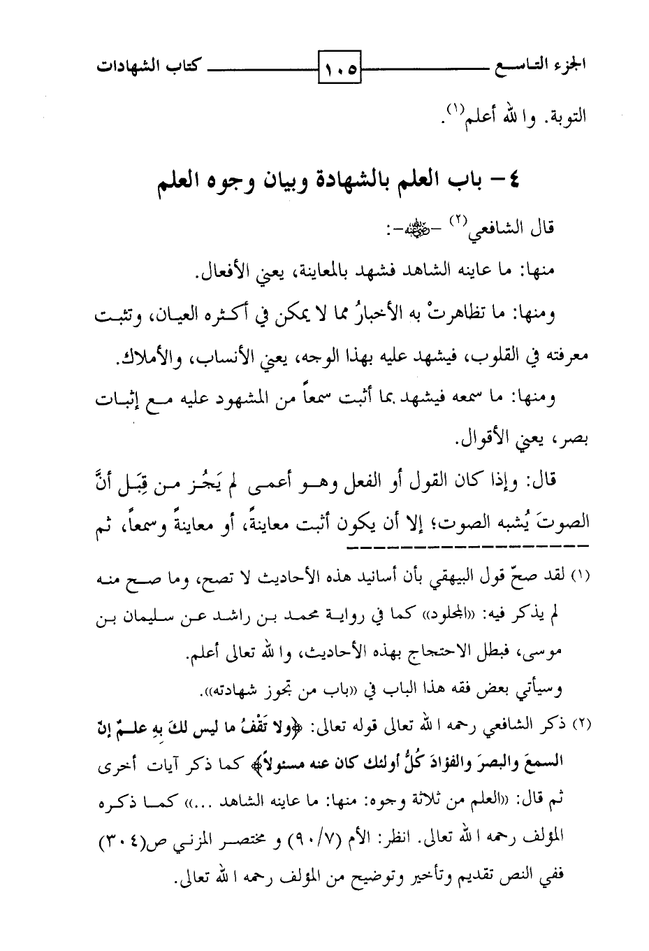 التوبة . والله أعلم ( 1 ) . 4 - باب العلم بالشهادة وبيان وجوه العلم قال الشافعي ( 2 ) - رضي الله عنه - : منها : ما عاينه الشاهد فشهد بالمعاينة ، يعني الأفعال . ومنها : ما تظاهرتْ به الأخبارُ مما لا يمكن في أكثره العيان ، وتثبت معرفته في القلوب ، فيشهد عليه بهذا الوجه ، يعني الأنساب ، والأملاك . ومنها : ما سمعه فيشهد بما أثبت سمعاً من المشهود عليه مع إثبات بصر ، يعني الأقوال . قال : وإذا كان القول أو الفعل وهو أعمى لم يَجُز من قِبَل أنَّ الصوتَ يُشبه الصوت ؛ إلا أن يكون أثبت معاينةً ، أو معاينةً وسمعاً ، ثم