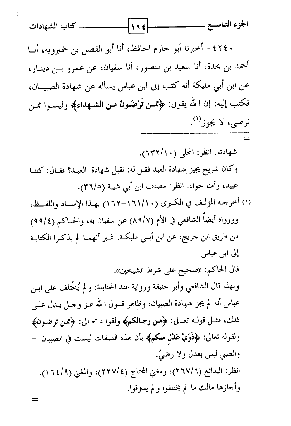 4240 - أخبرنا أبو حازم الحافظ ، أنا أبو الفضل بن خميرويه ، أنا أحمد بن نجدة ، أنا سعيد بن منصور ، أنا سفيان ، عن عمرو بن دينار ، عن ابن أبي مليكة أنه كتب إلى ابن عباس يسأله عن شهادة الصبيان ، فكتب إليه : إن الله يقول : ! ( ممن ترضون من الشهداء ) ! وليسوا ممن نرضى ، لا يجوز ( 1 ) .