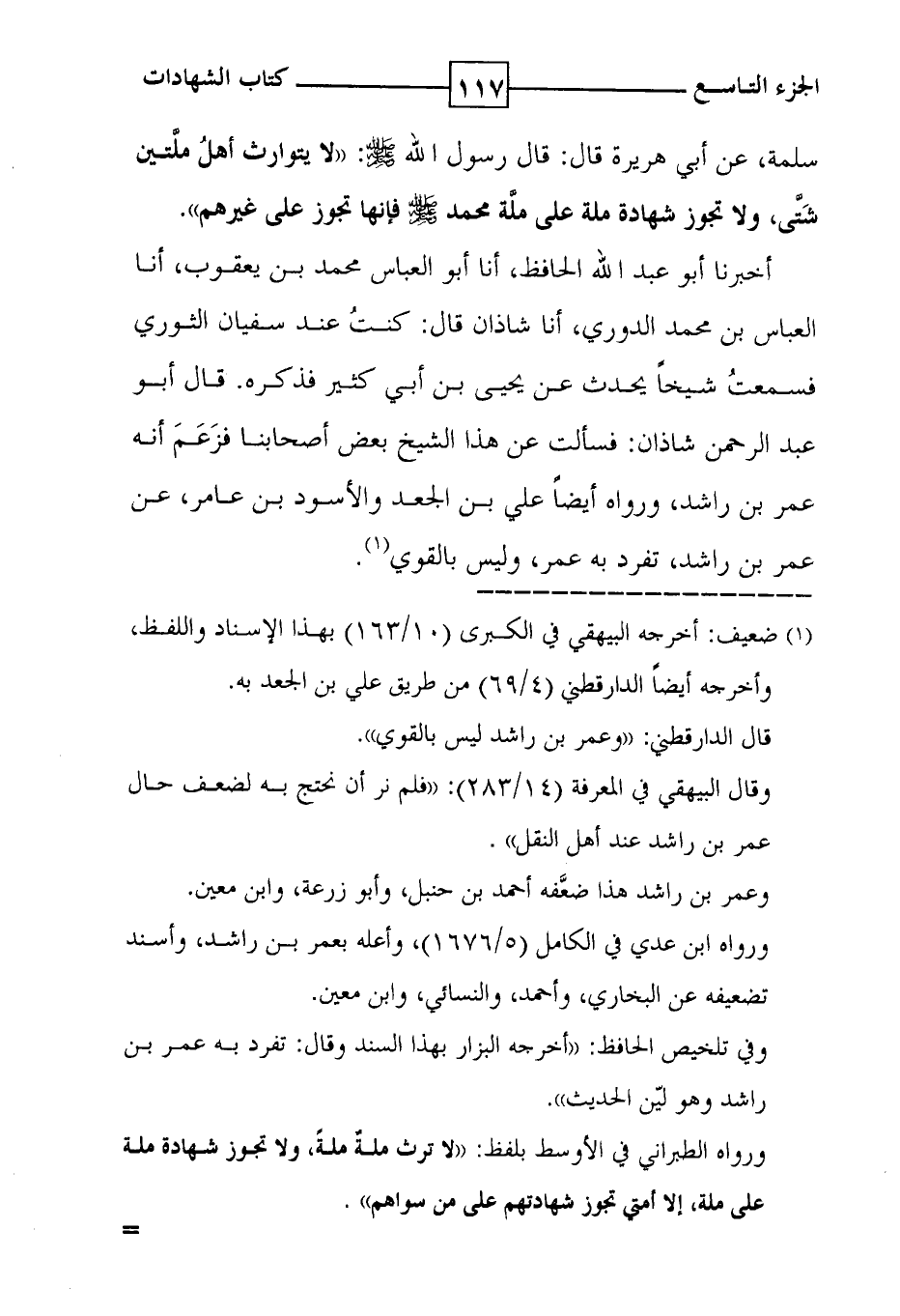 سلمة ، عن أبي هريرة قال : قال رسول الله : ' لا يتوارث أهلُ ملَّتين شَتَّى ، ولا تجوز شهادة ملة على ملَّة محمد فإنها تجوز على غيرهم ' . أخبرنا أبو عبد الله الحافظ ، أنا أبو العباس محمد بن يعقوب ، أنا العباس بن محمد الدوري ، أنا شاذان قال : كنتُ عند سفيان الثوري فسمعتُ شيخاً يحدث عن يحيى بن أبي كثير فذكره . قال أبو عبد الرحمن شاذان : فسألت عن هذا الشيخ بعض أصحابنا فزَعَمَ أنه عمر بن راشد ، ورواه أيضاً علي بن الجعد والأسود بن عامر ، عن عمر بن راشد ، تفرد بن عمر ، وليس بالقوي ( 1 ) .