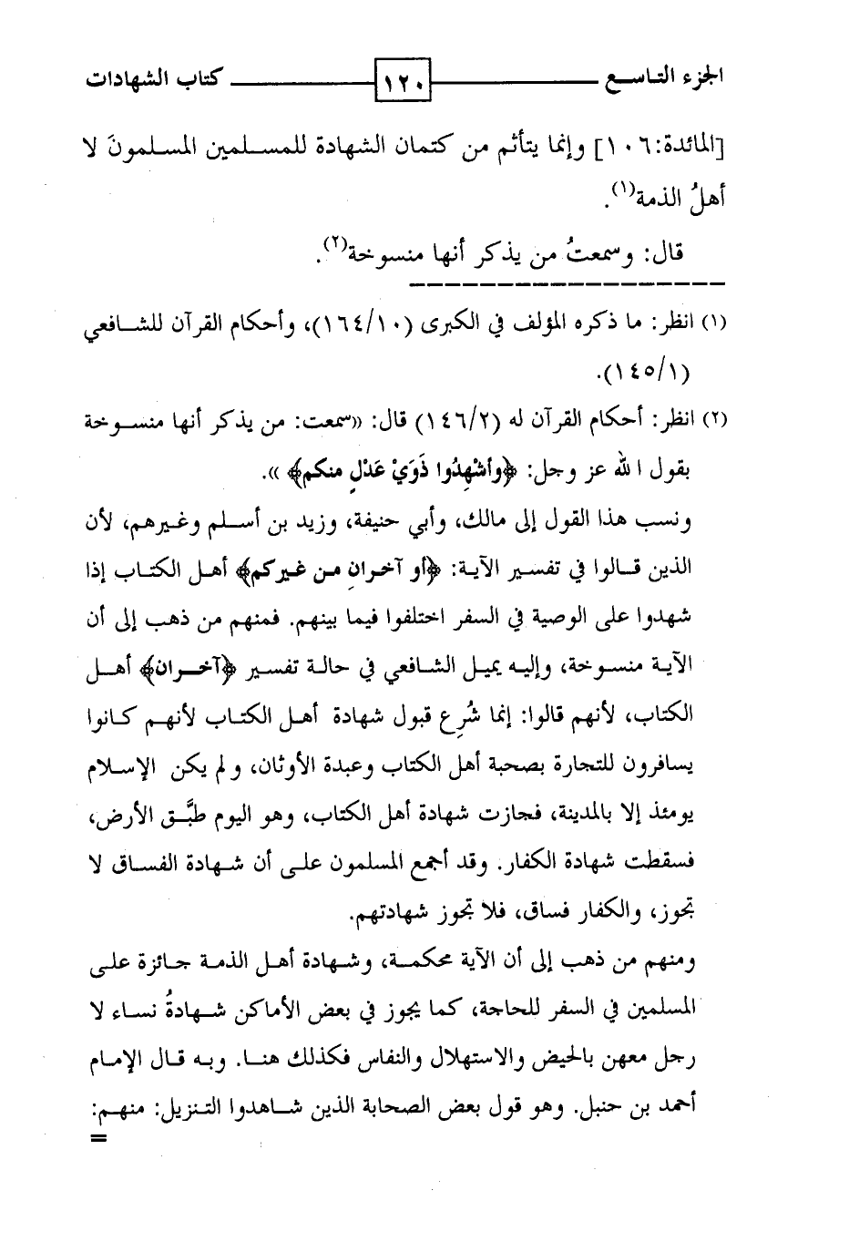 [ المائدة : 106 ] وإنما يتأثم من كتمان الشهادة للمسلمين المسلمونَ لا أهلُ الذمة ( 1 ) . قال : وسمعتُ من يذكر أنها منسوخة ( 2 ) .