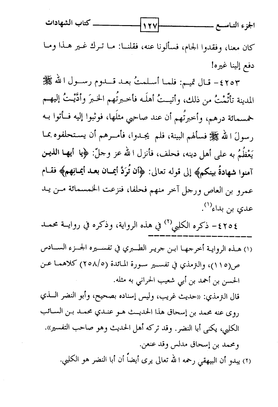 4253 - قال تميم : فلما أسلمتُ بعد قدوم رسول الله المدينة تأثَّمْتُ من ذلك ، وأتيتُ أهلَه فأخبرتُهم الخبرَ وأدَّيْتُ إليهم خمسمائة درهم ، وأخبرتُهم أن عند صاحبي مثلَها ، فوثبوا إليه فأتوا به رسولَ الله فسألهم البينة ، فلم يجدوا ، فأمرهم أن يستحلفوه بما يَعْظُمُ به على أهل دينه ، فحلف ، فأنزل الله عز وجلّ : ! ( يا أيها الذين آمنوا شهادة بينكم ) ! إلى قوله تعالى : ! ( أن ترد أيمان بعد أيمانهم ) ! فقام عمرو بن العاص ورجل آخر منهم فحلفا ، فنزعت الخمسمائة من يد عدي بن بداء ( 1 ) .