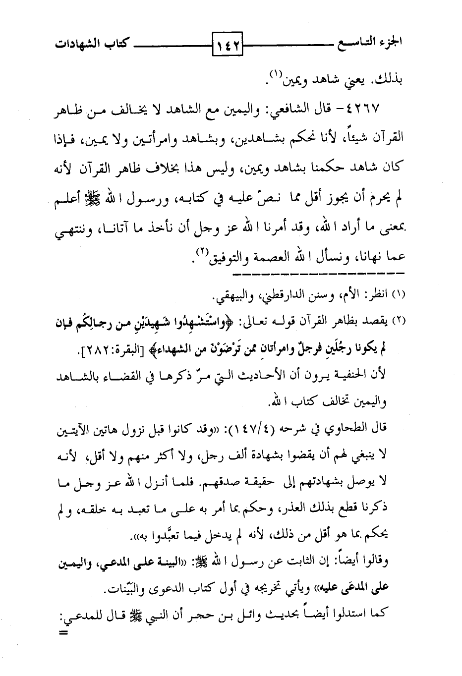 4267 - قال الشافعي : واليمين مع الشاهد لا يخالف من ظاهر القرآن شيئاً ، لأنا نحكم بشاهدين ، وبشاهد وامرأتين ولا يمين ، فإذا كان شاهد حكمنا بشاهد ويمين ، وليس هذا بخلاف ظاهر القرآن لأنه لم يحرم أن يجوز أقل مما نصّ عليه في كتابه ، ورسول الله أعلم بمعنى ما أراد الله ، وقد أمرنا الله عز وجل أن نأخذ ما آتانا ، وننتهي عما نهانا ، ونسأل الله العصمة والتوفيق ( 2 ) .