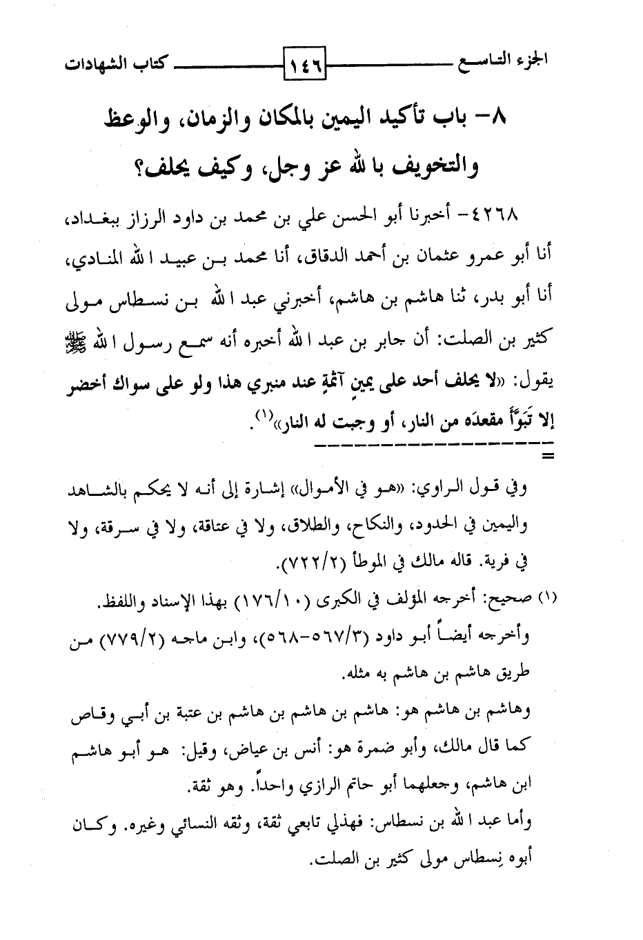 4268 - أخبرنا أبو الحسن علي بن محمد بن داود الرزاز ببغداد ، أنا أبو عمرو عثمان بن أحمد الدقاق ، أنا محمد بن عبيد الله المنادي ، أنا أبو بدر ، ثنا هاشم بن هاشم ، أخبرني عبد الله بن نسطاس مولى كثير بن الصلت : أن جابر بن عبد الله أخبره أنه سمع رسول الله يقول : ' لا يحلف أحد على يمينٍ آثمةٍ عند منبري هذا ولو على سواك أخضر إلا تَبَوَّأ مقعدَه من النار ، أو وجبت له النار ' ( 1 ) .