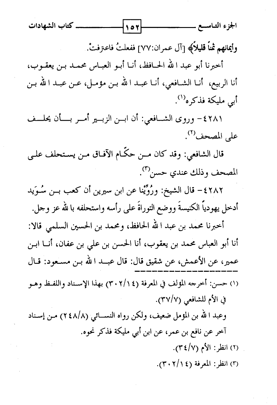 4281 - وروى الشافعي : أن ابن الزبير أمر بأن يحلف على المصحف ( 2 ) . قال الشافعي : وقد كان من حكّام الآفاق من يستحلف على المصحف وذلك عندي حسن ( 3 ) .