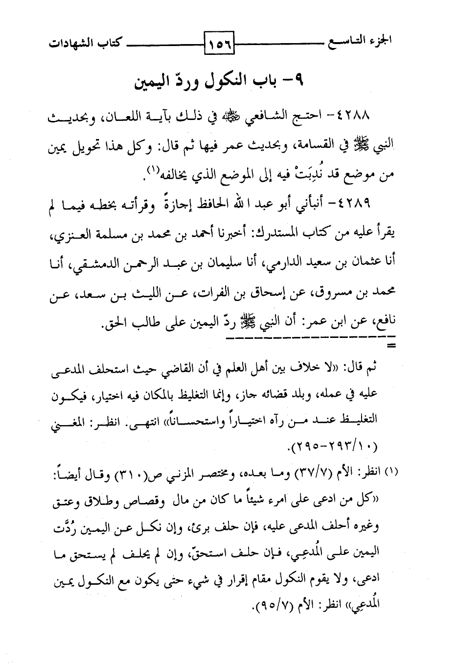 4289 - أنبأني أبو عبد الله الحافظ إجازةً وقرأته بخطه فيما لم يقرأ عليه من كتاب المستدرك : أخبرنا أحمد بن محمد بن مسلمة العنزي ، أنا عثمان بن سعيد الدارمي ، أنا سليمان بن عبد الرحمن الدمشقي ، أنا محمد بن مسروق ، عن إسحاق بن الفرات ، عن الليث بن سعد ، عن نافع ، عن ابن عمر : أن النبي ردّ اليمين على طالب الحق .
