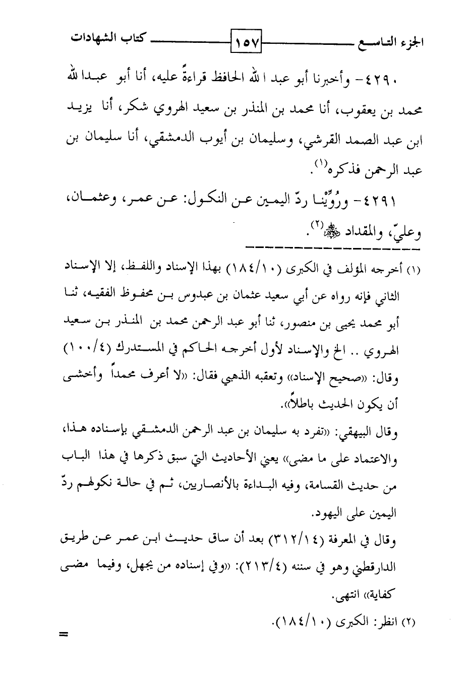 4291 - ورُوِّيْنا ردّ اليمين عن النكول : عن عمر ، وعثمان ، وعليّ ، والمقداد رضي الله عنهم ( 2 ) .