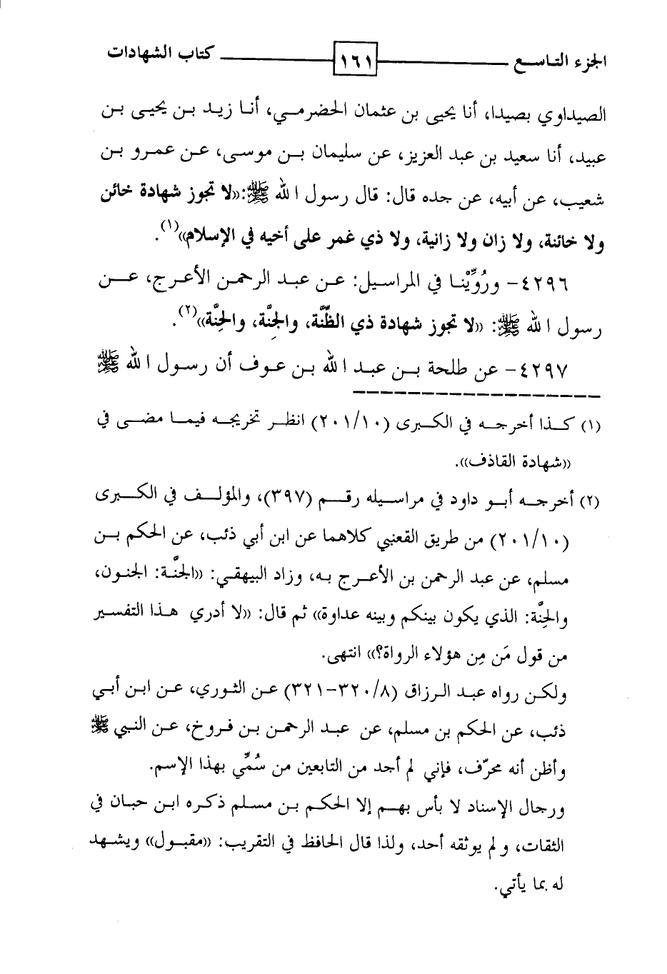 4296 - ورُوِّيْنا في المراسيل : عن عبد الرحمن الأعرج ، عن رسول الله : ' لا تجوز شهادة ذي الظُّنَّة ، والجِنَّة ، والحِنَّة ' ( 2 ) .