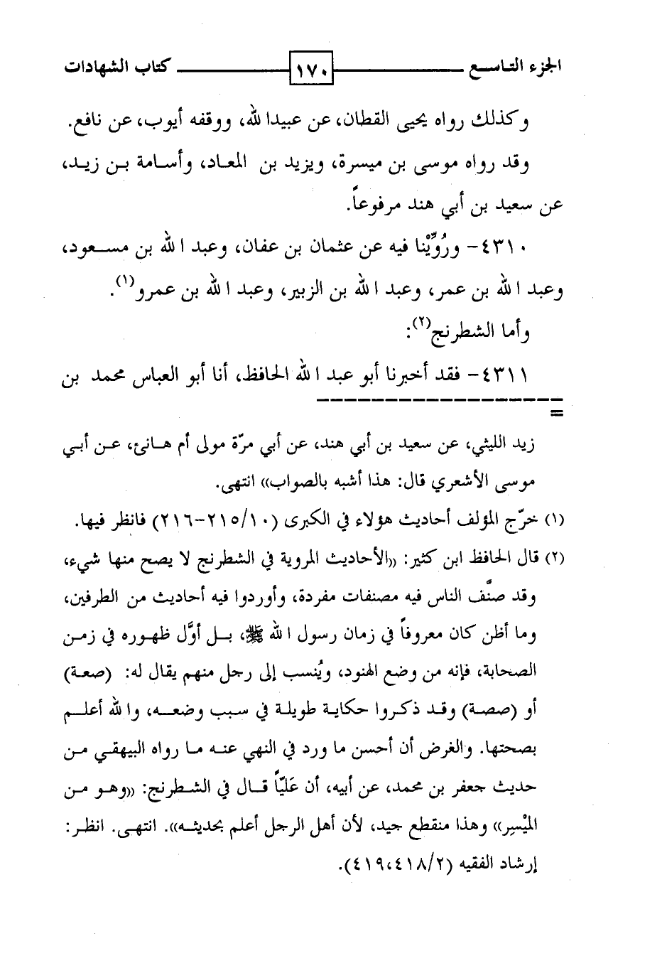 4310 - ورُوِّيْنا فيه عن عثمان بن عفان ، وعبد الله بن مسعود ، وعبد الله بن عمر ، وعبد الله بن الزبير ، وعبد الله بن عمرو ( 1 ) . وأما الشطرنج ( 2 ) :