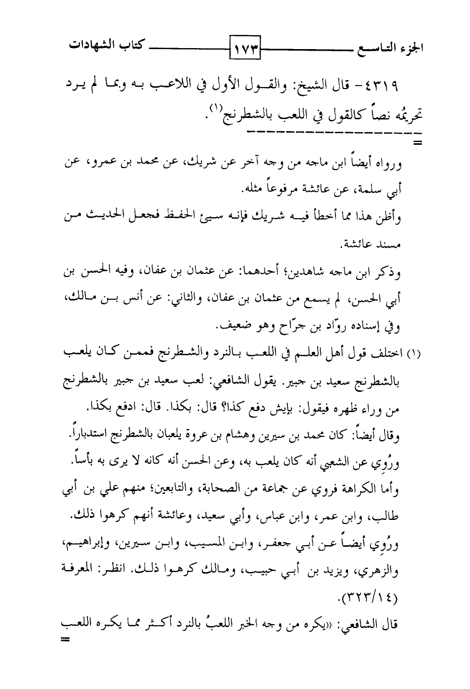 4319 - قال الشيخ : والقول الأول في اللاعب به وبما لم يرد تحريمُه نصاً كالقول في اللعب بالشطرنج ( 1 ) .