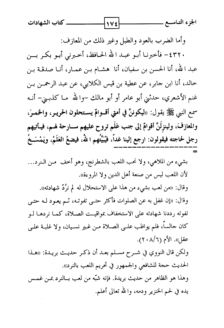4320 - فأخبرنا أبو عبد الله الحافظ ، أخبرني أبو بكر بن عبد الله ، أنا الحسن بن سفيان ، أنا هشام بن عمار ، أنا صدقة بن خالد ، أنا ابن جابر ، عن عطية بن قيس الكلابي ، عن عبد الرحمن بن غنم الأشعري ، حدثني أبو عامر أو أبو مالك - والله ما كذبني - أنه سمع النبي يقول : ' ليكوننَّ في أمتي أقوامٌ يستحلون الحرير ، والخمرَ ، والمعازفَ ، ولينزِلَنَّ أقوامٌ إلى جنب عَلَم تروح عليهم سارحة لهم ، فيأتيهم رجل لحاجته فيقولون : ارجع إلينا غداً ، فيُبَيِّتُهم اللهُ ، فيضعُ العَلَمُ ، ويَمْسَخُ