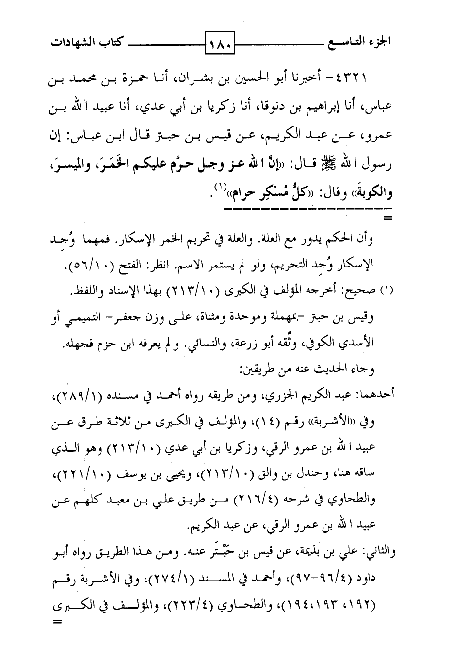 4321 - أخبرنا أبو الحسين بن بشران ، أنا حمزة بن محمد بن عباس ، أنا إبراهيم بن دنوقا ، أنا زكريا بن أبي عدي ، أنا عبيد الله بن عمرو ، عن عبد الكريم ، عن قيس بن حبتر قال ابن عباس : إن رسول الله قال : ' إنَّ الله عز وجل حرَّم عليكم الخَمَرَ ، والميسرَ ، والكوبةَ ' وقال : ' كلُّ مُسْكِر حرام ' ( 1 ) .