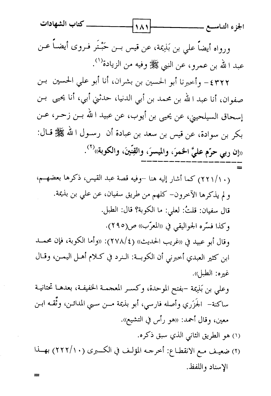 4322 - وأخبرنا أبو الحسين بن بشران ، أنا أبو علي الحسين بن صفوان ، أنا عبد الله بن محمد بن أبي الدنيا ، حدثني أبي ، أنا يحيى بن إسحاق السيلحيني ، عن يحيى بن أيوب ، عن عبيد الله بن زحر ، عن بكر بن سوادة ، عن قيس بن سعد بن عبادة أن رسول الله قال : ' إن ربي حرّم عليَّ الخمرَ ، والميسرَ ، والقِنّينَ ، والكوبة ' ( 2 ) .