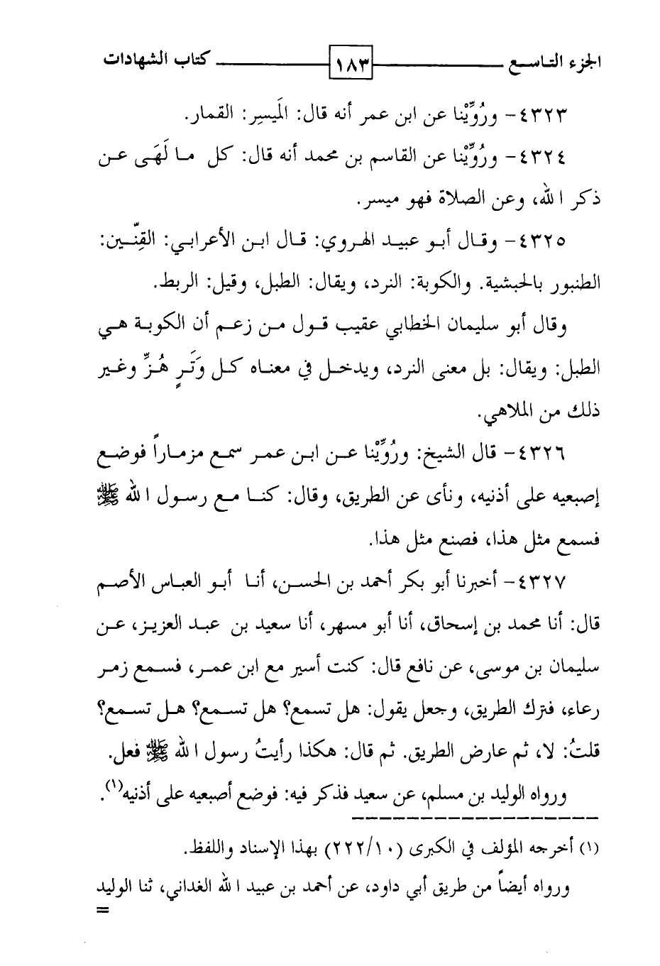 4326 - قال الشيخ : ورُوِّيْنا عن ابن عمر سمع مزماراً فوضع إصبعيه على أذنيه ، ونأى عن الطريق ، وقال : كنا مع رسول الله فسمع مثل هذا ، فصنع مثل هذا .