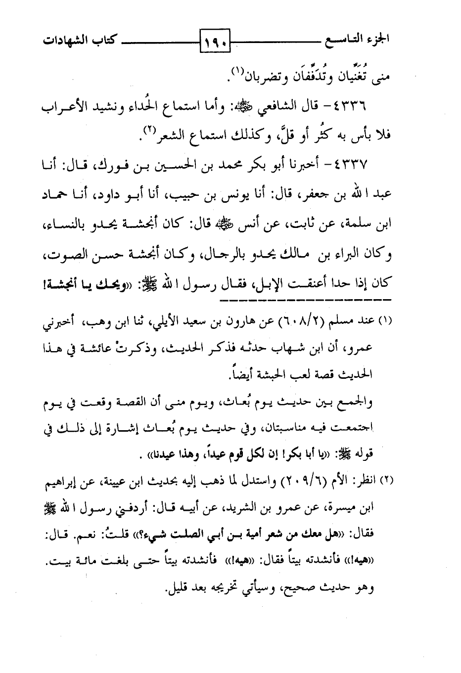 4336 - قال الشافعي رضي الله عنه : وأما استماع الحُداء ونشيد الأعراب فلا بأس به كثُر أو قلَّ ، وكذلك استماع الشعر ( 2 ) .