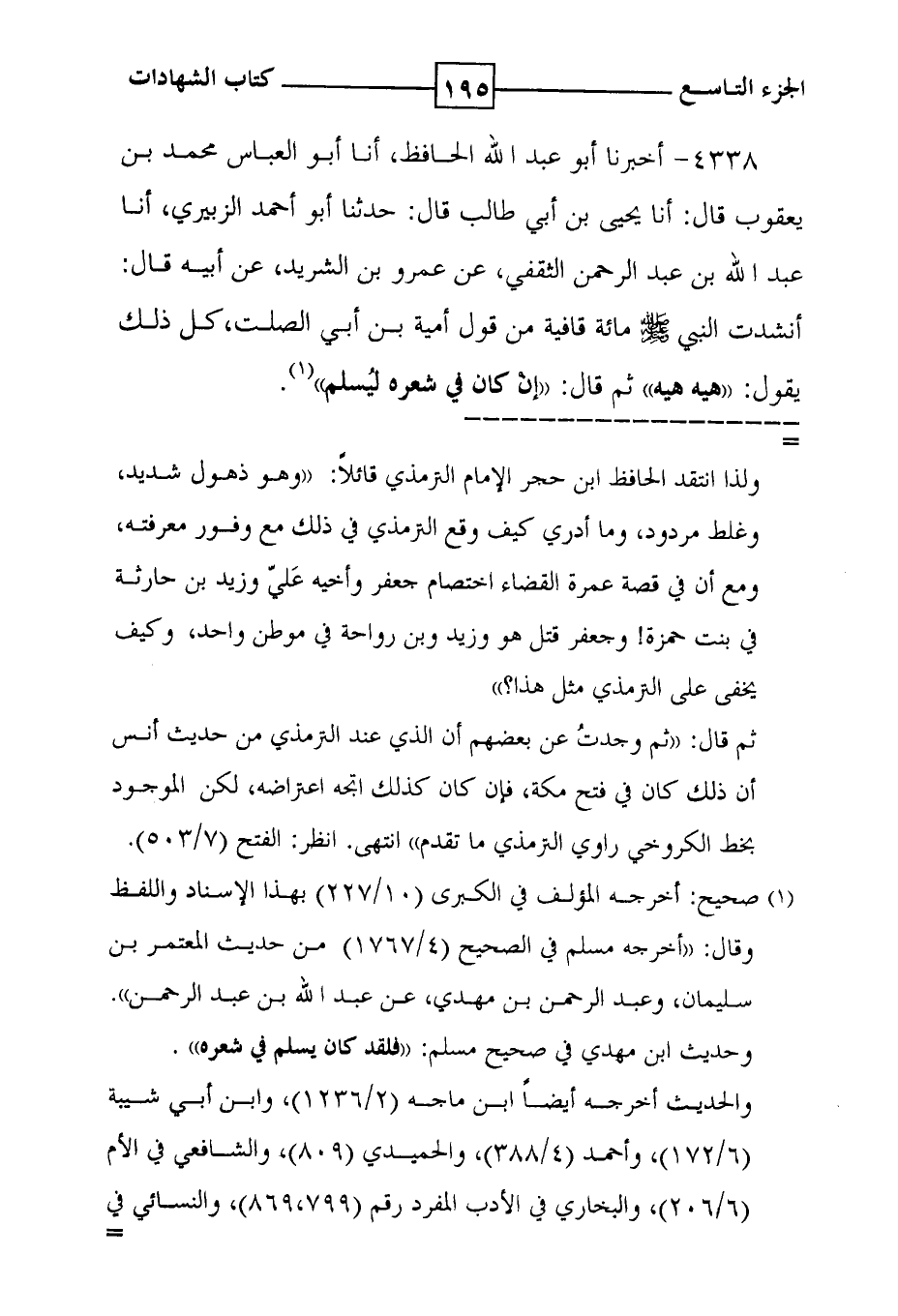4338 - أخبرنا أبو عبد الله الحافظ ، أنا أبو العباس محمد بن يعقوب قال : أنا يحيى بن أبي طالب قال : حدثنا أبو أحمد الزبيري ، أنا عبد الله بن عبد الرحمن الثقفي ، عن عمرو بن الشريد ، عن أبيه قال : أنشدت النبي مائة قافية من قول أمية بن أبي الصلت ، كل ذلك يقول ' هيه هيه ' ثم قال : ' إن كان في شعره ليُسلم ' ( 1 ) .