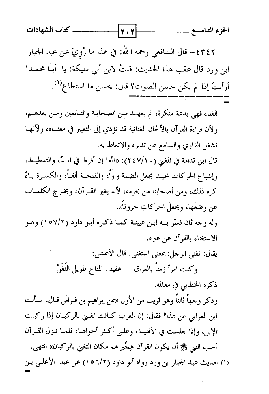 4342 - قال الشافعي رحمه الله : في هذا ما رُوِيَ عن عبد الجبار ابن ورد قال عقب هذا الحديث : قلتُ لابن أبي مليكة : يا أبا محمد ! أرأيتَ إذا لم يكن حسن الصوت ؟ قال : يحسن ما استطاع ( 1 ) .