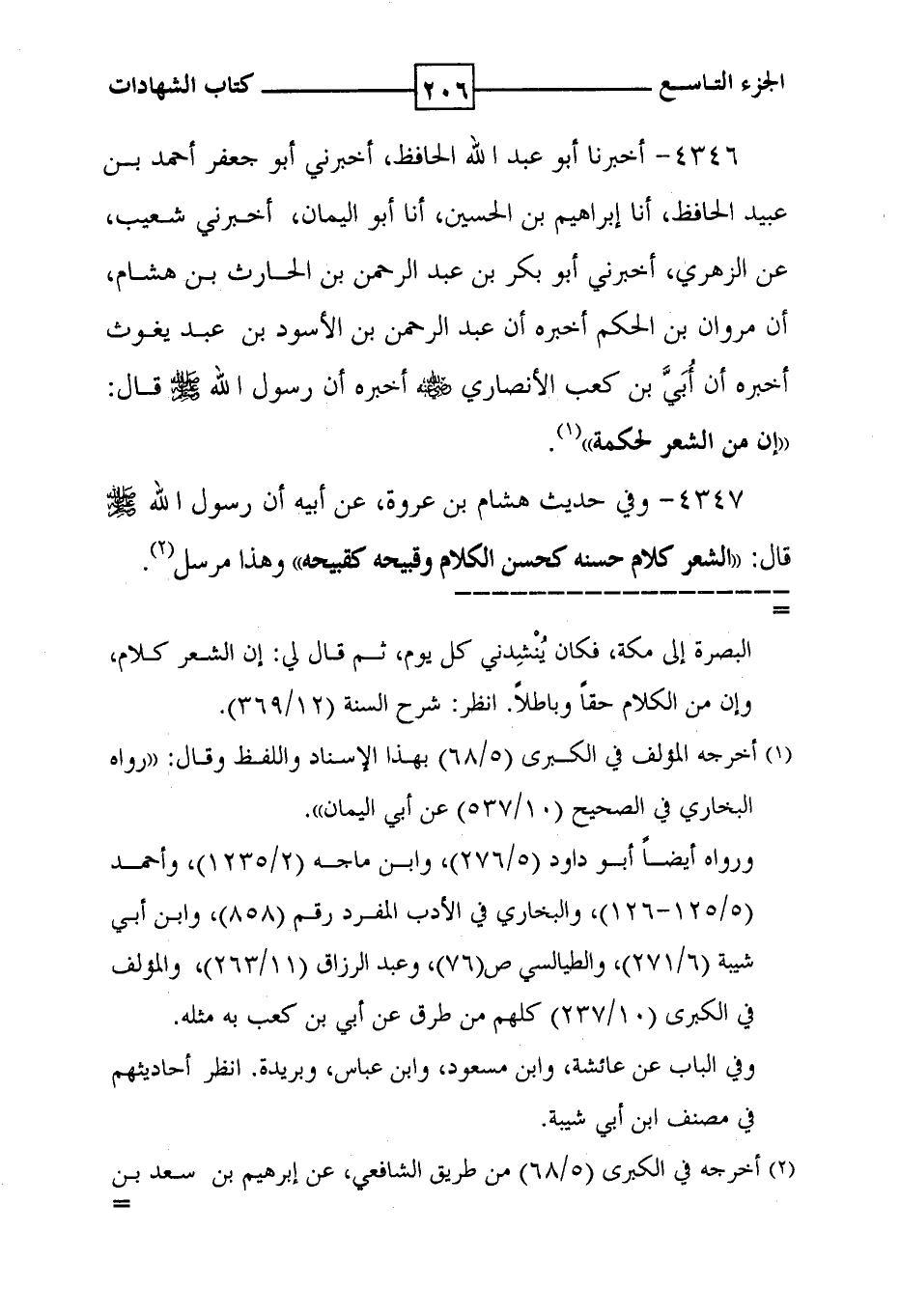 4346 - أخبرنا أبو عبد الله الحافظ ، أخبرني أبو جعفر أحمد بن عبيد الحافظ ، أنا إبراهيم بن الحسين ، أنا أبو اليمان ، أخبرني شعيب ، عن الزهري ، أخبرني أبو بكر بن عبد الرحمن بن الحارث بن هشام ، أن مروان بن الحكم أخبره أن عبد الرحمن بن الأسود بن عبد يغوث أخبره أن أُبَيَّ بن كعب الأنصاري رضي الله عنه أخبره أن رسول الله قال : ' إن من الشعر لحكمة ' ( 1 ) .