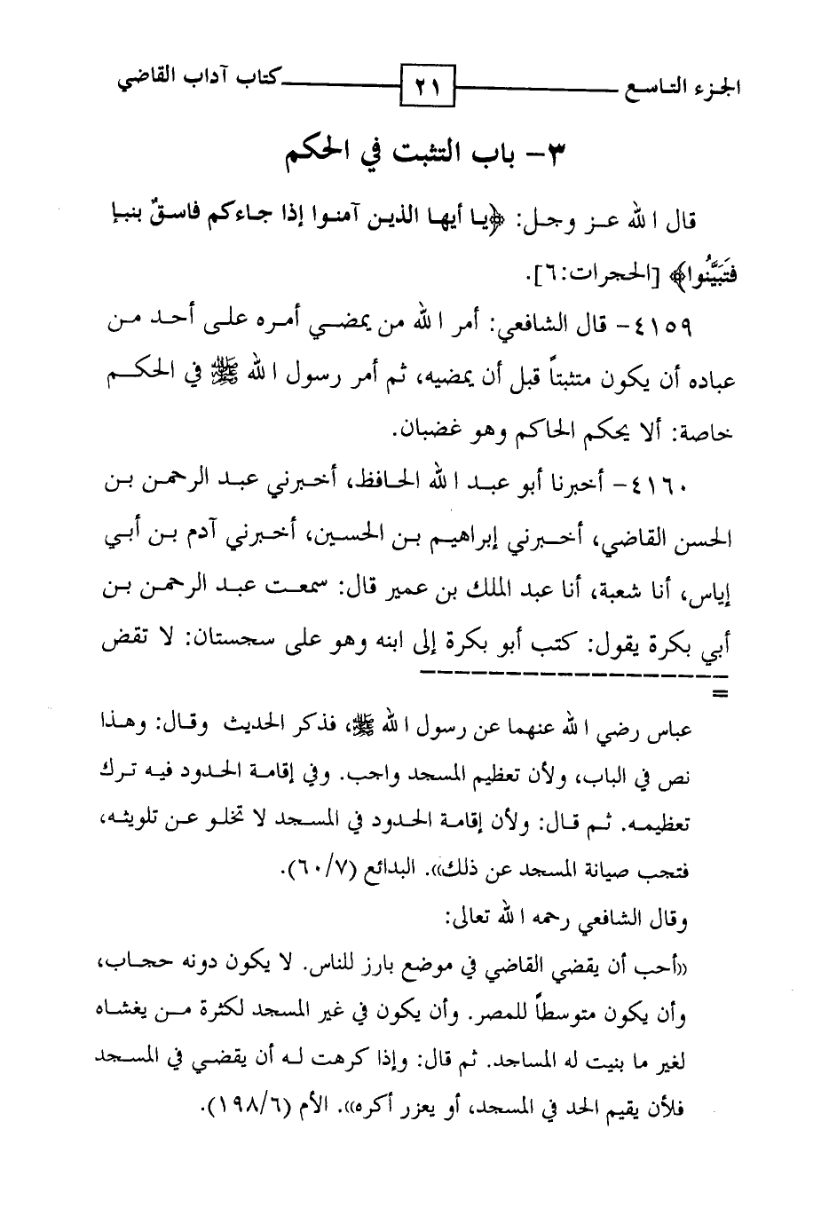 4159 - قال الشافعي : أمر الله من يمضي أمره على أحد من عباده أن يكون متثبتاً قبل أن يمضيه ، ثم أمر رسول الله في الحكم خاصة : ألا يحكم الحاكم وهو غضبان .