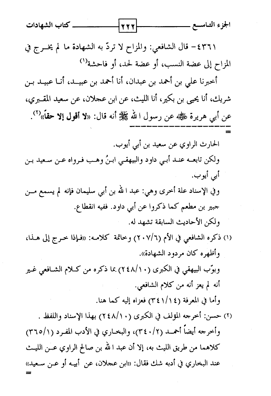 4361 - قال الشافعي : والمزاح لا تردّ به الشهادة ما لم يخرج في المزاح إلى عضة النسب ، أو عضة لحد ، أو فاحشة ( 1 ) . أخبرنا علي بن أحمد بن عبدان ، أنا أحمد بن عبيد ، أنا عبيد بن شريك ، أنا يحيى بن بكير ، أنا الليث ، عن ابن عجلان ، عن سعيد المقبري ، عن أبي هريرة رضي الله عنه عن رسول الله أنه قال : ' لا أقول إلا حقاً ' ( 2 ) .