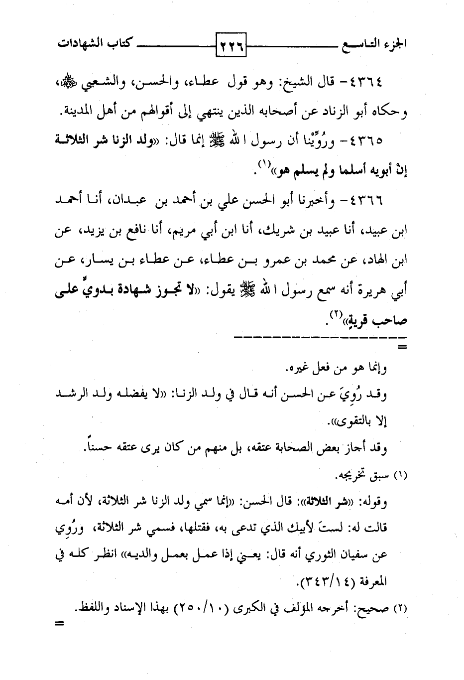 4366 - وأخبرنا أبو الحسن علي بن أحمد بن عبدان ، أنا أحمد ابن عبيد ، أنا عبيد بن شريك ، أنا ابن أبي مريم ، أنا نافع بن يزيد ، عن ابن الهاد ، عن محمد بن عمرو بن عطاء ، عن عطاء بن يسار ، عن أبي هريرة أنه سمع رسول الله يقول : ' لا تجوز شهادة بدويٍّ على صاحب قريةٍ ' ( 2 ) .