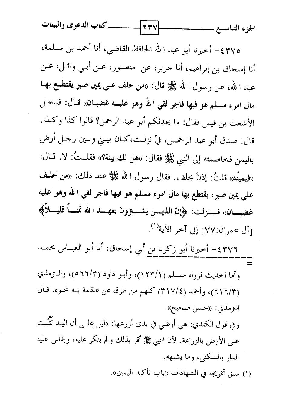 4375 - أخبرنا أبو عبد الله الحافظ القاضي ، أنا أحمد بن سلمة ، أنا إسحاق بن إبراهيم ، أنا جرير ، عن منصور ، عن أبي وائل ، عن عبد الله ، عن رسول الله قال : ' من حلف على يمين صبر يقتطع بها مال امرء مسلم هو فيها فاجر لقي الله وهو عليه غضبان ' قال : فدخل الأشعث بن قيس فقال : ما يحدثكم أبو عبد الرحمن ؟ قالوا كذا وكذا . قال : صدق أبو عبد الرحمن ، فيّ نزلت ، كان بيني وبين رجل أرض باليمن فخاصمته إلى النبي فقال : ' هل لك بينة ؟ ' فقلتُ : لا . قال : ' فيمينُه ' قلتُ : إذنْ يحلف . فقال رسول الله عند ذلك : ' من حلف على يمين صبر ، يقتطع بها مال امرء مسلم هو فيها فاجر لقي الله وهو عليه غضبان ' فنزلت : ( إنّ الذين يشترونَ بعهد الله ثمناً قليلاً ) [ آل عمران : 77 ] إلى آخر الآية ( 1 ) .