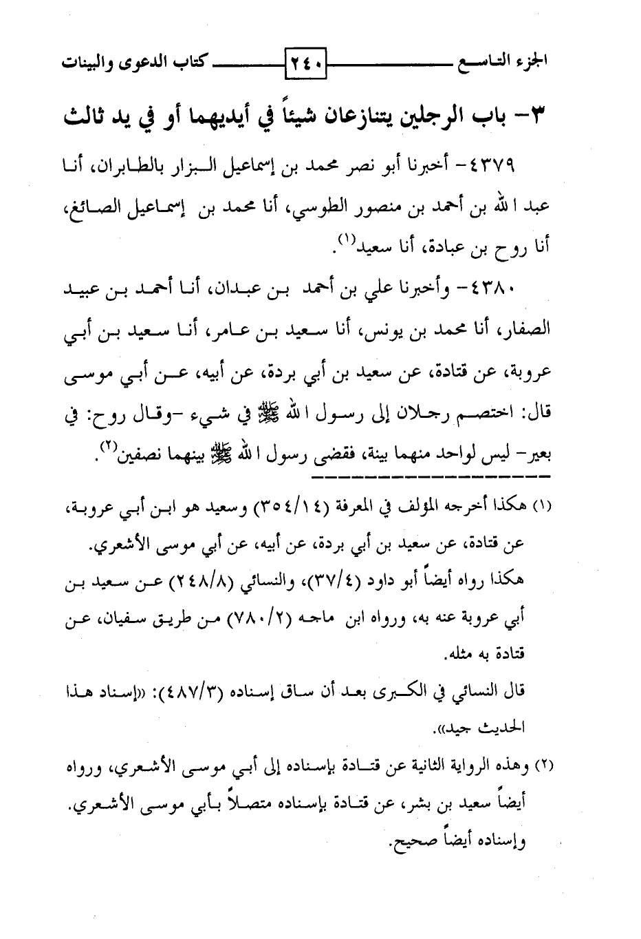 4380 - وأخبرنا علي بن أحمد بن عبدان ، أنا أحمد بن عبيد الصفار ، أنا محمد بن يونس ، أنا سعيد بن عامر ، أنا سعيد بن أبي عروبة ، عن قتادة ، عن سعيد بن أبي بردة ، عن أبيه ، عن أبي موسى قال : اختصم رجلان إلى رسول الله في شيء - وقال روح : في بعير - ليس لواحد منهما بينة ، فقضى رسول الله بينهما نصفين ( 2 ) .