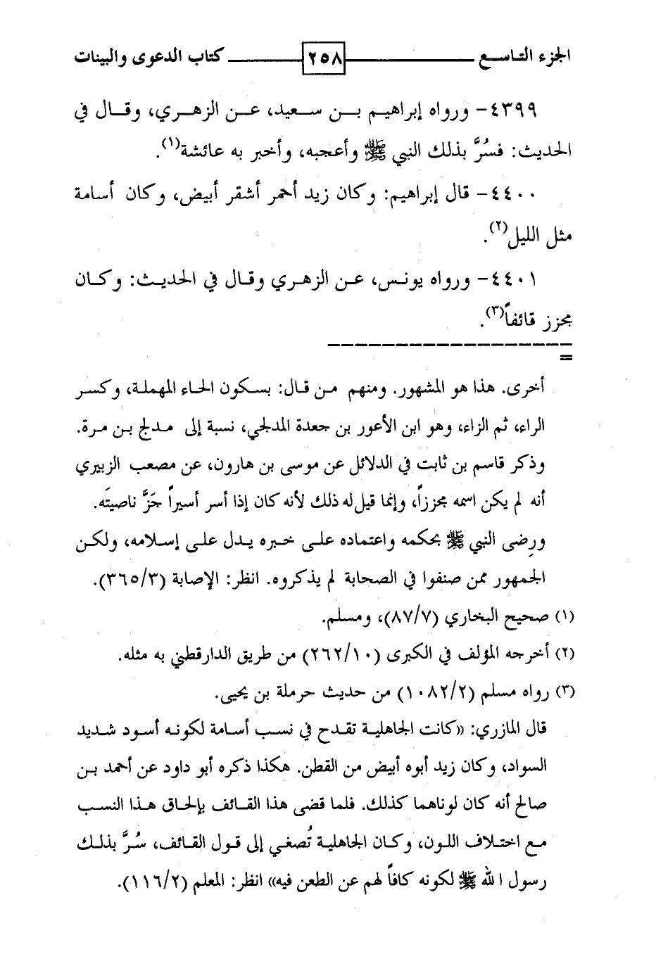 4399 - ورواه إبراهيم بن سعيد ، عن الزهري ، وقال في الحديث : فسُرَّ بذلك النبي وأعجبه ، وأخبر به عائشة ( 1 ) .