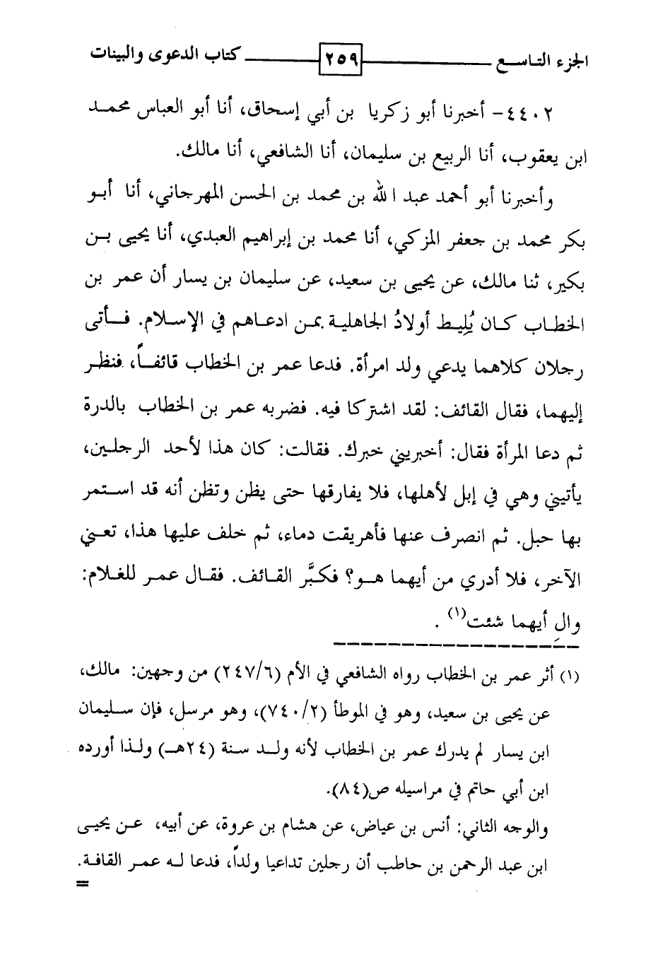 4402 - أخبرنا أبو زكريا بن أبي إسحاق ، أنا أبو العباس محمد ابن يعقوب ، أنا الربيع بن سليمان ، أنا الشافعي ، أنا مالك . وأخبرنا أبو أحمد عبد الله بن محمد بن الحسن المهرجاني ، أنا أبو بكر محمد بن جعفر المزكي ، أنا محمد بن إبراهيم العبدي ، أنا يحيى بن بكير ، ثنا مالك ، عن يحيى بن سعيد ، عن سليمان بن يسار أن عمر بن الخطاب كان يُلِيط أولادُ الجاهلية بمن ادعاهم في الإسلام . فأتى رجلان كلاهما يدعي ولد امرأة . فدعا عمر بن الخطاب قائفاً ، فنظر إليهما ، فقال القائف : لقد اشتركا فيه . فضربه عمر بن الخطاب بالدرة ثم دعا المرأة فقال : أخبريني خبرك . فقالت : كان هذا لأحد الرجلين ، يأتيني وهي في إبل لأهلها ، فلا يفارقها حتى يظن وتظن أنه قد استمر بها حبل . ثم انصرف عنها فأهريقت دماء ، ثم خلف عليها هذا ، تعني الآخر ، فلا أدري من أيهما هو ؟ فكبَّر القائف . فقال عمر للغلام : والِ أيهما شئت ( 1 ) .