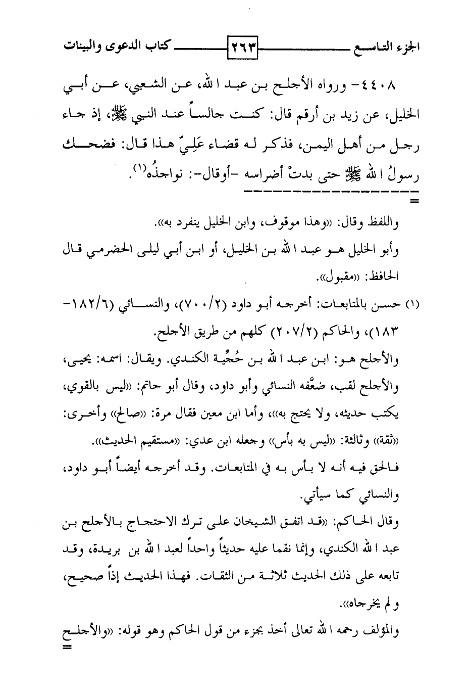 4408 - ورواه الأجلح بن عبد الله عن الشعبي ، عن أبي الخليل ، عن زيد بن أرقم قال : كنت جالساً عند النبي ، إذ جاء رجل من أهل اليمن ، فذكر له قضاء عَلِيّ هذا قال : فضحك رسولُ الله حتى بدتْ أضراسه - أو قال - : نواجِذُه ( 1 ) .