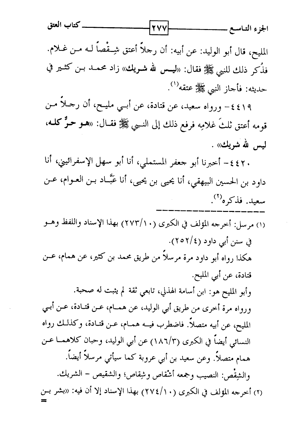 4419 - ورواه سعيد ، عن قتادة ، عن أبي مليح ، أن رجلاً من قومه أعتق ثلثَ غلامِه فرفع ذلك إلى النبي فقال : ' هو حرٌّ كله ، ليس لله شريك ' .
