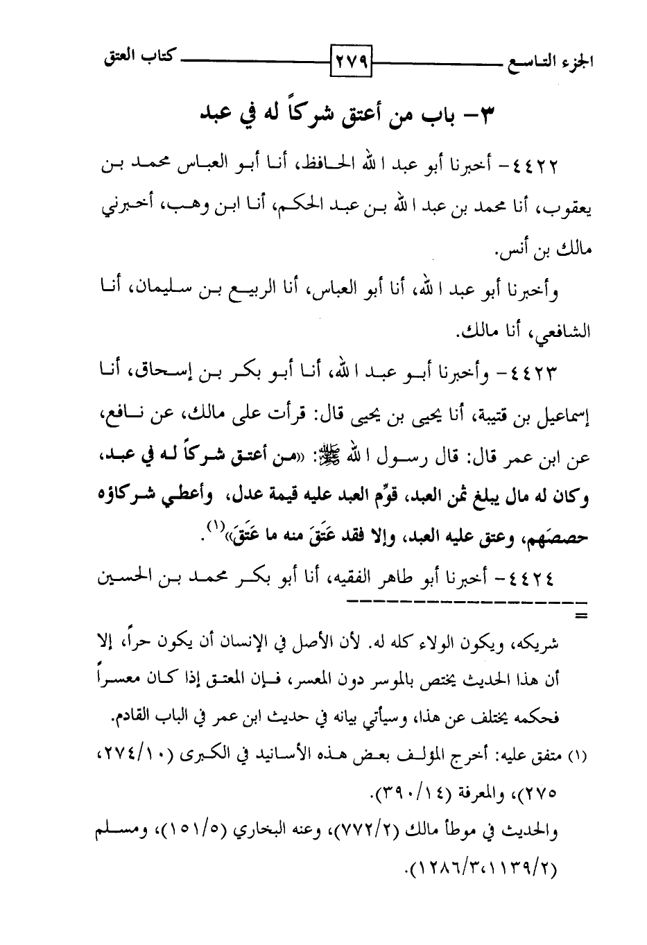 4423 - وأخبرنا أبو عبد الله ، أنا أبو بكر بن إسحاق ، أنا إسماعيل بن قتيبة ، أنا يحيى بن يحيى قال : قرأت على مالك ، عن نافع ، عن ابن عمر قال : قال رسول الله : ' من أعتق شركاً له في عبد ، وكان له مال يبلغ ثمن العبد ، قوِّم العبد عليه قيمة عدل ، وأعطي شركاؤه حصصَهم ، وعتق عليه العبد ، وإلا فقد عَتَقَ منه ما عَتَقَ ' ( 1 ) .