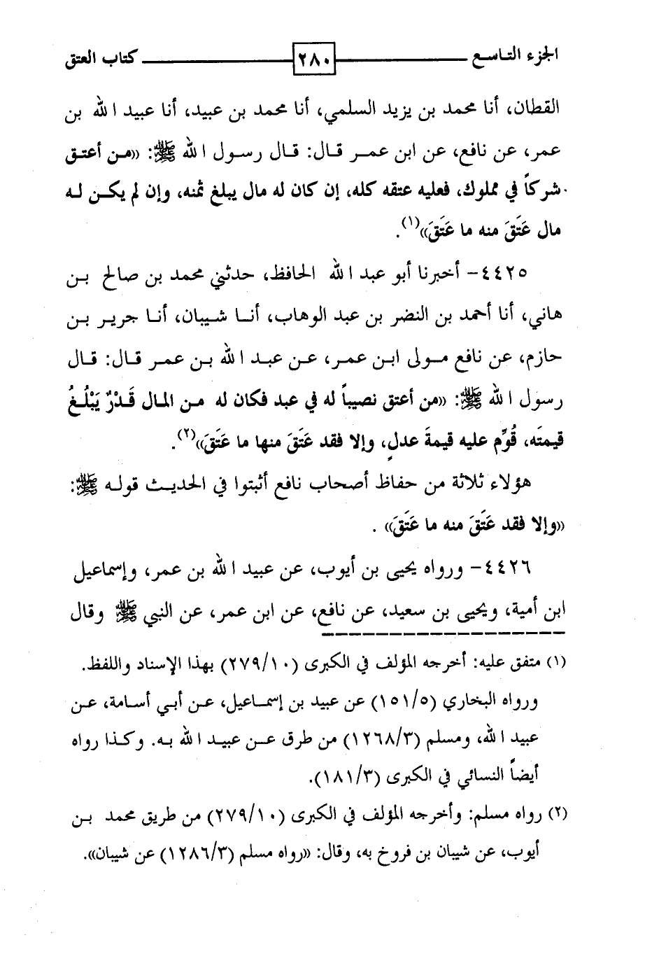 4425 - أخبرنا أبو عبد الله الحافظ ، حدثني محمد بن صالح بن هاني ، أنا أحمد بن النضر بن عبد الوهاب ، أنا شيبان ، أنا جرير بن حازم ، عن نافع مولى ابن عمر ، عن عبد الله بن عمر قال : قال رسول الله : ' من أعتق نصيباً له في عبد فكان له من المال قَدْرٌ يَبْلُغُ قيمتَه ، قُوِّم عليه قيمةَ عدلٍ ، وإلا فقد عَتَقَ منها ما عَتَقَ ' ( 2 ) . هؤلاء ثلاثة من حفاظ أصحاب نافع أثبتوا في الحديث قوله : ' وإلا فقد عَتَقَ منه ما عَتَقَ ' .