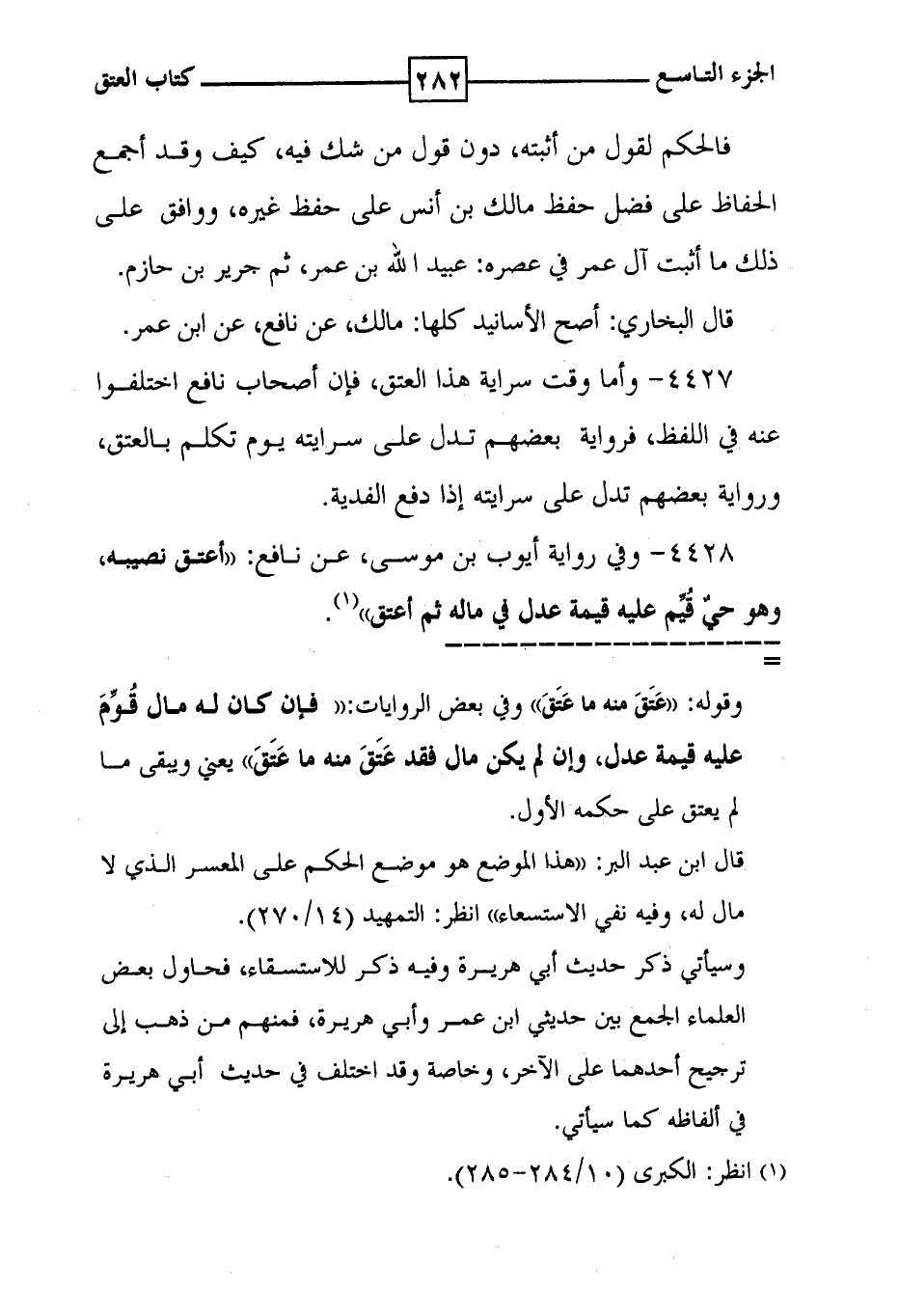 4427 - وأما وقت سراية هذا العتق ، فإن أصحاب نافع اختلفوا عنه في اللفظ ، فرواية بعضهم تدل على سرايته يوم تكلم بالعتق ، ورواية بعضهم تدل على سرايته إذا دفع الفدية .