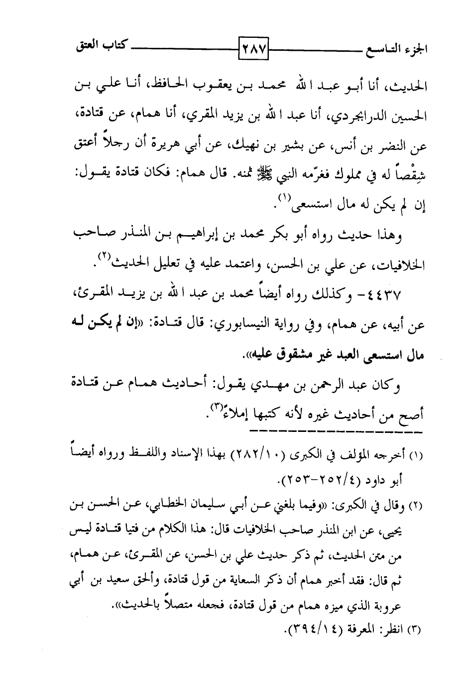 الحديث ، أنا أبو عبد الله محمد بن يعقوب الحافظ ، أنا علي بن الحسين الداربجردي ، أنا عبد الله بن يزيد المقري ، أنا همام ، عن قتادة ، عن النضر بن أنس ، عن بشير بن نهيك ، عن أبي هريرة أن رجلاً أعتق شِقْصاً له في مملوك فغرّمه النبي ثمنه . قال همام : فكان قتادة يقول : إن لم يكن له مال استسعى ( 1 ) . وهذا حديث رواه أبو بكر محمد بن إبراهيم بن المنذر صاحب الخلافيات ، عن علي بن الحسن ، واعتمد عليه في تعليل الحديث ( 2 ) .