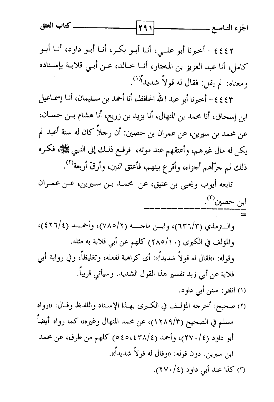 4443 - أخبرنا أبو عبد الله الحافظ ، أنا أحمد بن سليمان ، أنا إسماعيل ابن إسحاق ، أنا محمد بن المنهال ، أنا يزيد بن زريع ، أنا هشام بن حسان ، عن محمد بن سيرين ، عن عمران بن حصين : أن رجلاً كان له ستة أعبد لم يكن له مال غيرهم ، وأعتقهم عند موته ، فرفع ذلك إلى النبي ، فكره ذلك ثم جزّأهم أجزاء ، وأقرع بينهم ، فأعتق اثنين ، وأرقّ أربعة ( 2 ) . تابعه أيوب ويحيى بن عتيق ، عن محمد بن سيرين ، عن عمران ابن حصين ( 3 ) .