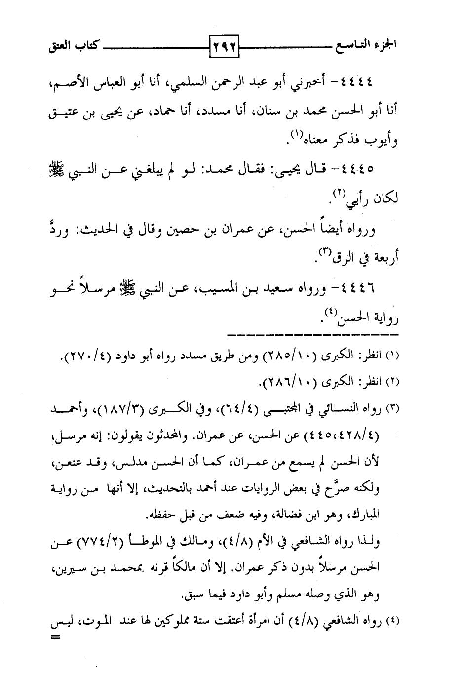 4445 - قال يحيى : فقال محمد : لو لم يبلغني عن النبي لكان رأيي ( 2 ) . ورواه أيضاً الحسن ، عن عمران بن حصين وقال في الحديث : وردَّ أربعة في الرق ( 3 ) .