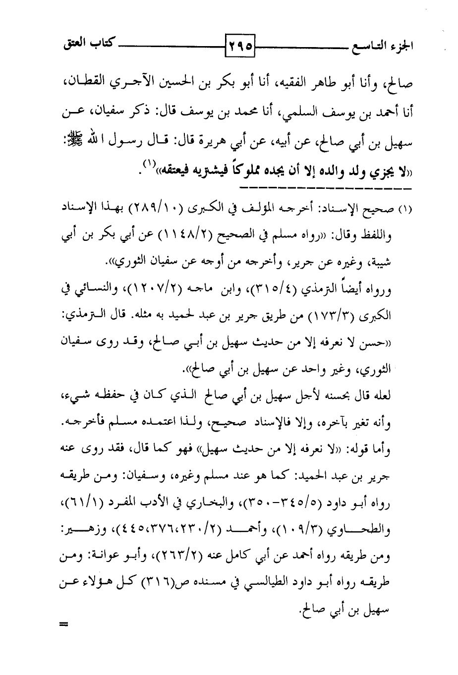 صالح ، وأنا أبو طاهر الفقيه ، أنا أبو بكر بن الحسين الآجري القطان ، أنا أحمد بن يوسف السلمي ، أنا محمد بن يوسف قال : ذكر سفيان ، عن سهيل بن أبي صالح ، عن أبيه ، عن أبي هريرة قال : قال رسول الله : ' لا يجزي ولد والده إلا أن يجده مملوكاً فيشتريه فيعتقه ' ( 1 ) .