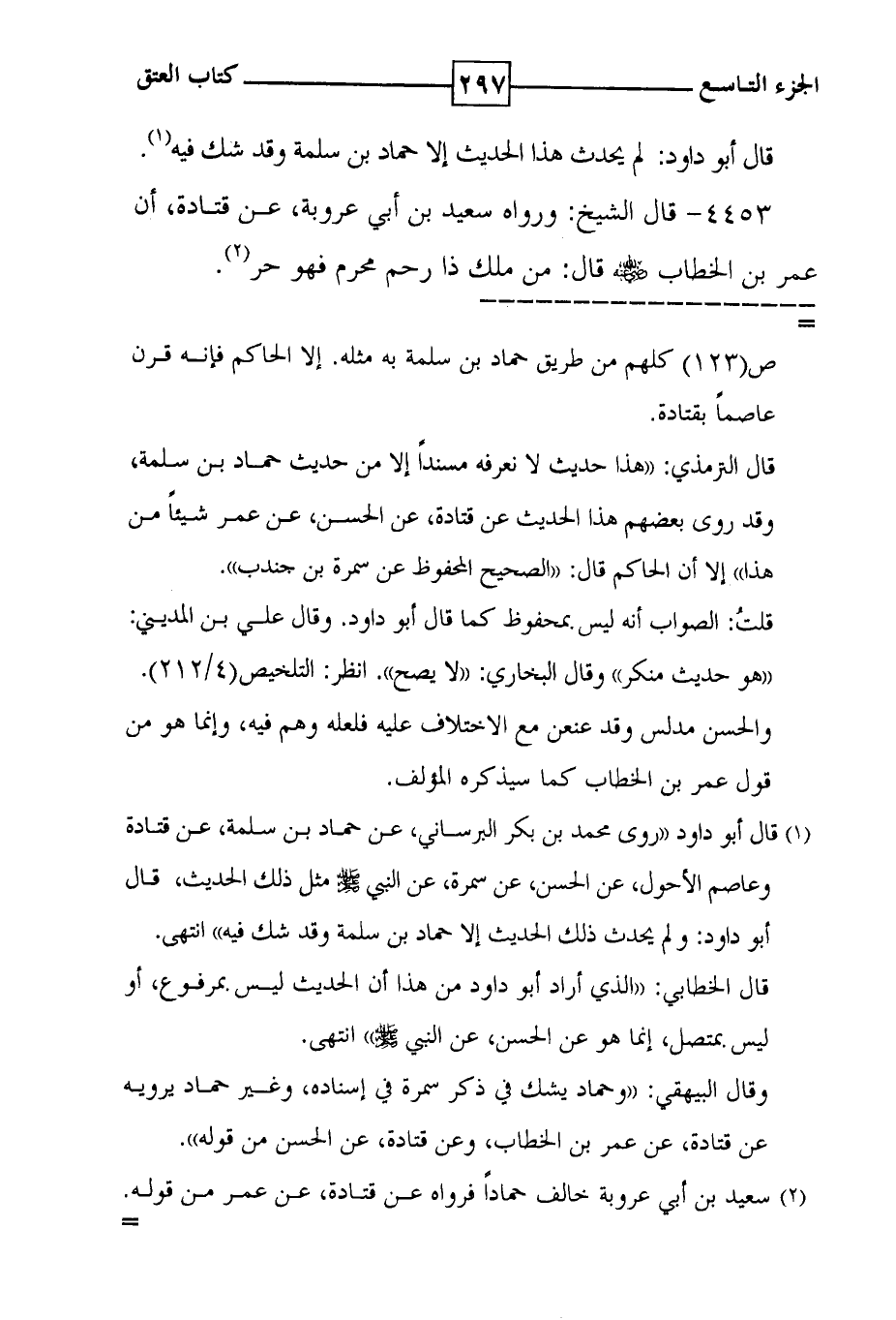 4453 - قال الشيخ : ورواه سعيد بن أبي عروبة ، عن قتادة ، أن عمر بن الخطاب رضي الله عنه قال : من ملك ذا رحم محرم فهو حر ( 2 ) .
