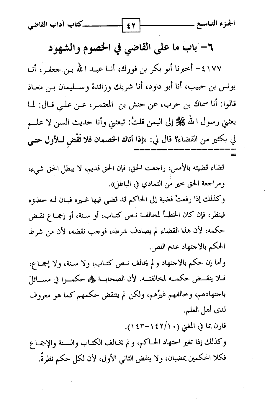 4177 - أخبرنا أبو بكر بن فورك ، أنا عبد الله بن جعفر ، أنا يونس بن حبيب ، أنا أبو داود ، أنا شريك وزائدة وسليمان بن معاذ قالوا : أنا سماك بن حرب ، عن حنش بن المعتمر ، عن علي قال : لما بعثني رسول الله إلى اليمن قلتُ : تبعثني وأنا حديث السن لا علم لي بكثير من القضاء ؟ قال لي : ' إذا أتاك الخصمان فلا تَقْضِ للأول حتى
