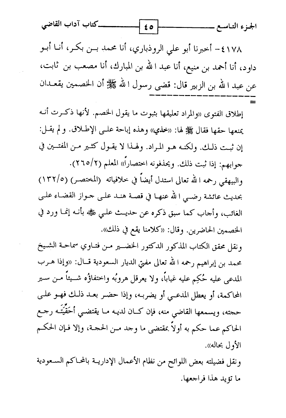 4178 - أخبرنا أبو علي الروذباري ، أنا محمد بن بكر ، أنا أبو داود ، أنا أحمد بن منيع ، أنا عبد الله بن المبارك ، أنا مصعب بن ثابت ، عن عبد الله بن الزبير قال : قضى رسول الله أن الخصمين يقعدان