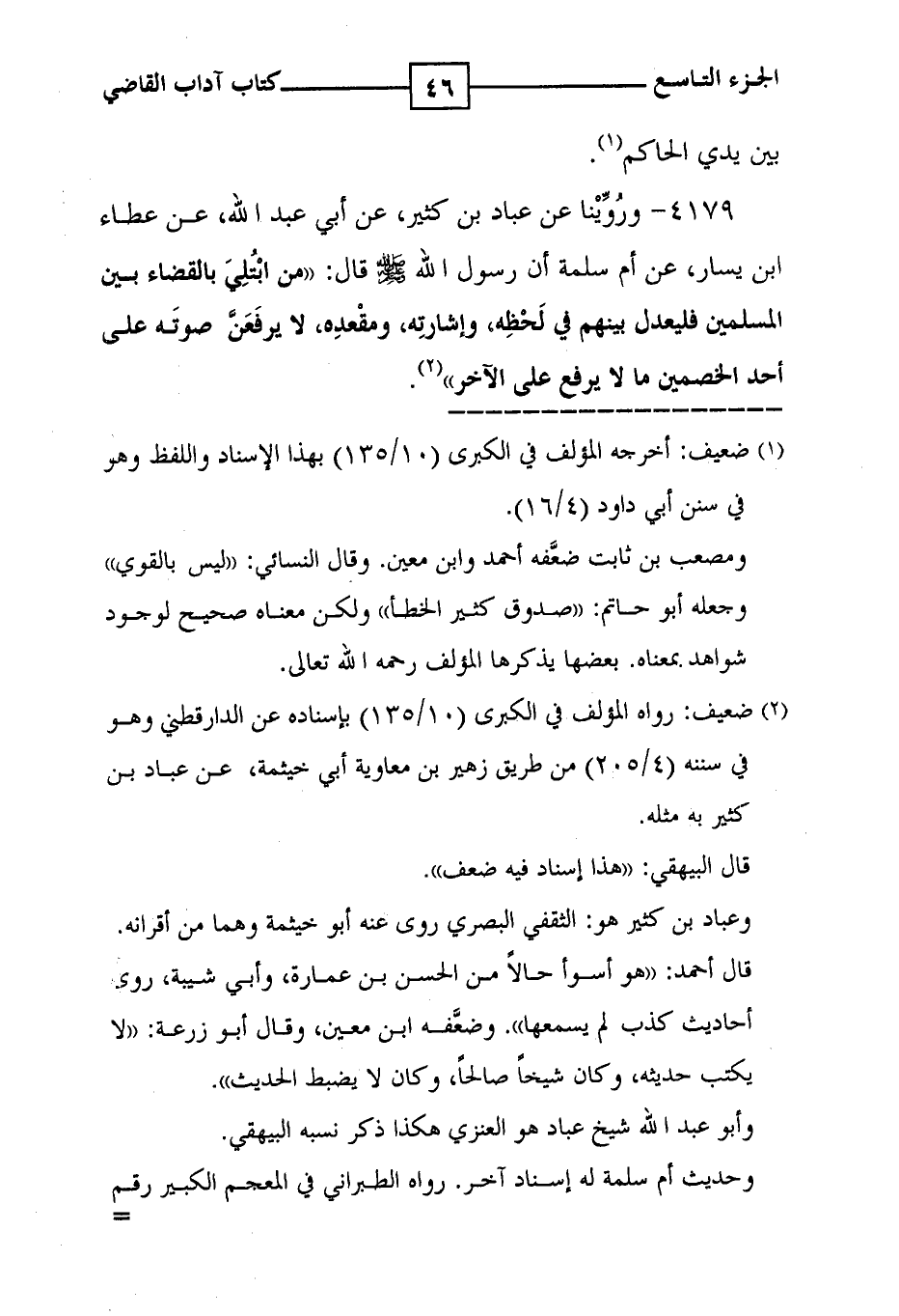 4179 - ورُوِّيْنا عن عباد بن كثير ، عن أبي عبد الله ، عن عطاء ابن يسار ، عن أم سلمة أن رسول الله قال : ' من ابْتُلِيَ بالقضاء بين المسلمين فليعدل بينهم في لَحْظِه ، وإشارتِه ، ومقْعدِه ، لا يرفَعَنَّ صوتَه على أحد الخصمين ما لا يرفع على الأخر ' ( 2 ) .